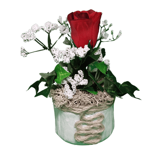 Présentation d’une rose et végétaux artificiels dans un pot décoré.